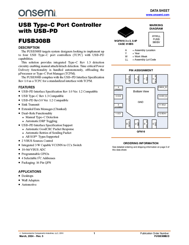 FUSB308BV USB Type-C Port Controller with USB-PD