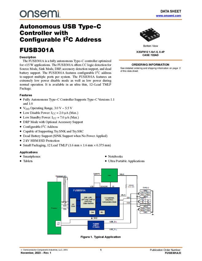 FUSB301A Autonomous USB Type-C Controller with Configurable I<sup>2C Address