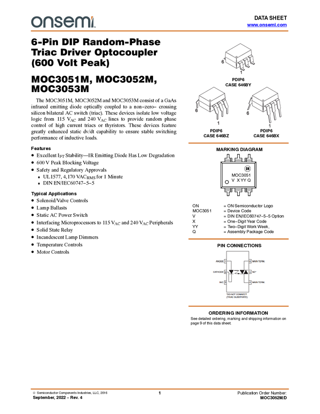 MOC3051M Triac Driver Optocoupler, 6-Pin DIP Random-Phase