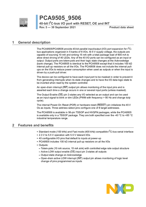 PCA9505DGG 40-bit I2C-bus I/O port with RESET, OE and INT