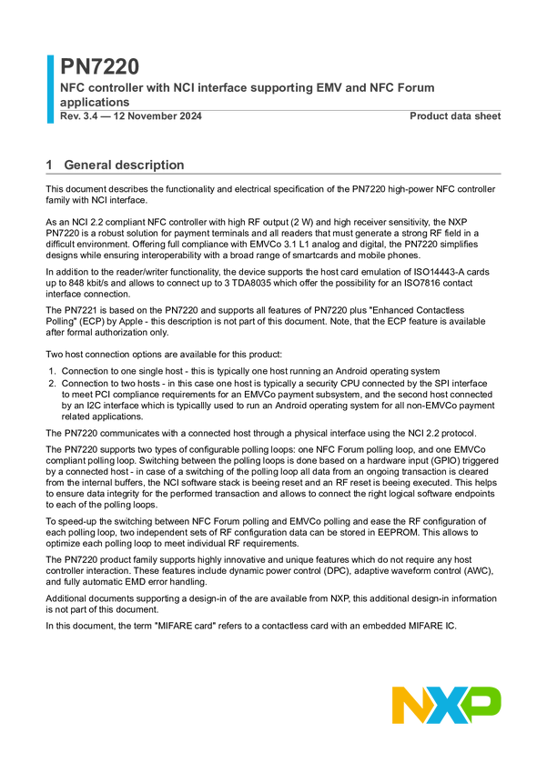 PN7220EV High-Performance, One-Chip NFC Controller for EMVCo 3.1 and NFC Forum Opera...