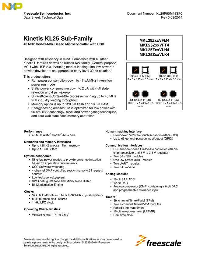 MKL25Z32VFT4, MKL25Z64VLH4, MKL25Z32VLK4, MKL25Z64VLK4, MKL25Z128VFM4, MKL25Z64VFM4, MKL25Z64VFT4, MKL25Z128VLH4, MKL25Z128VLK4, MKL25Z32VFM4, MKL25Z32VLH4