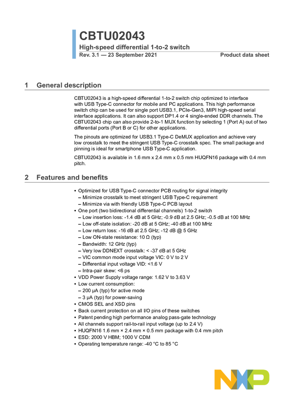 CBTU02043HE High-Speed Differential 1-to-2 Switch Chip