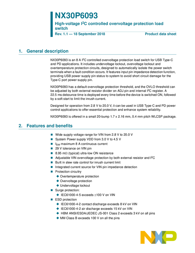 NX30P6093UK 30 V OVP, 100V Surge with moisture detection, 9mohm RDSON