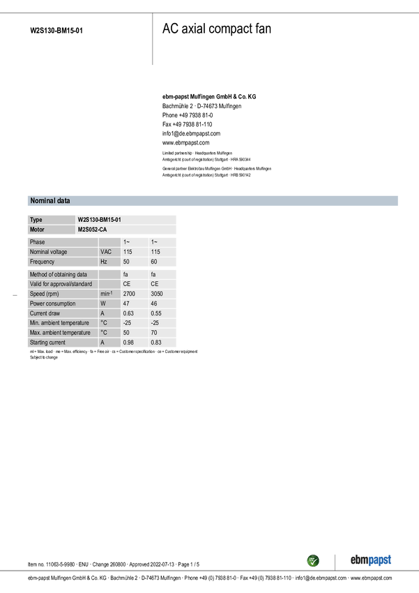 W2S130BM1501115VAC Wentylator 115V AC 172x150x55 47W 0,63A 115 V AC łożysko kulka Przewody dł ok 0,33 m RPM 2700 obr / min