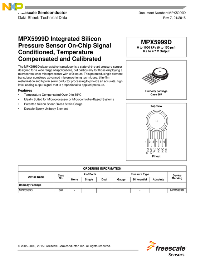 MPX5999D Pressure Sensor, 5V, 0/1000kPa, Sensor 6