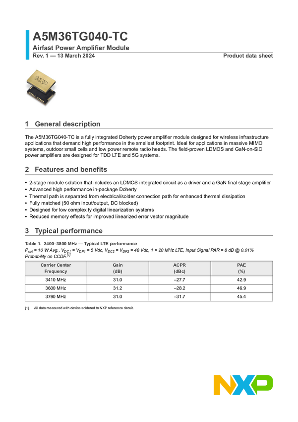 A5M36TG040-TC Airfast Power Amplifier Module, 3400-3800 MHz, 31 dB, 10 W Avg.