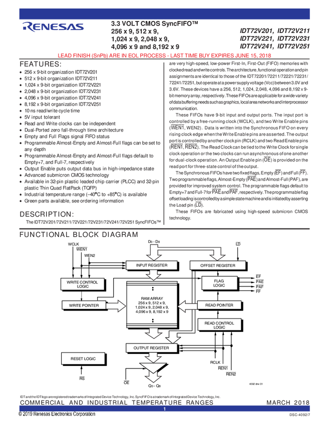 72V251L15JGI 8K x 9 SyncFIFO, 3.3V
