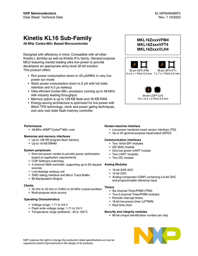 - MKL16Z64VFT4, MKL16Z64VFM4, MKL16Z128VFM4, MKL16Z32VLH4, MKL16Z32VFT4, MKL16Z32VFM4, MKL16Z128VFT4, MKL16Z64VLH4