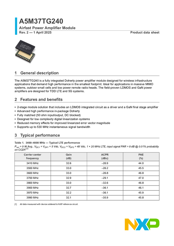 A5M37TG240 Airfast Power Amplifier Module, 3400-4000 MHz, 32 dB, 9 W Avg.