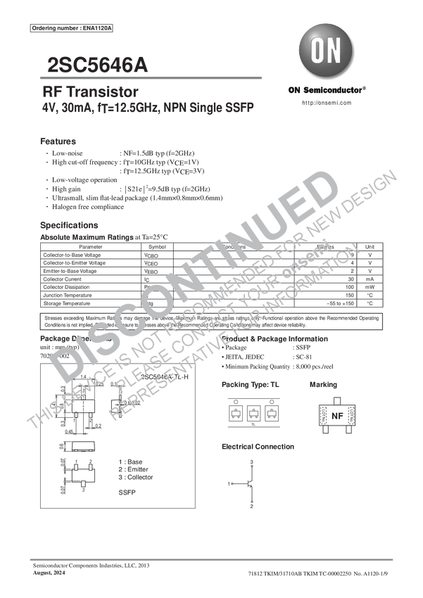 2SC5646A RF Transistor, NPN Single, 4 V, 30 mA, f<sub>T = 12.5 GHz