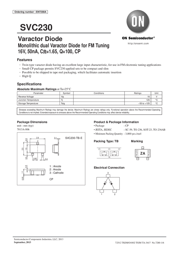 SVC230 Varactor Diode, 16V, 50nA, CR=1.65, Q=100, Monolithic Dual CP