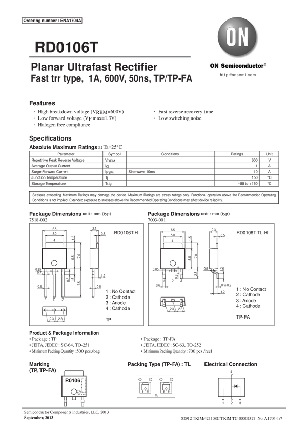 RD0106T Planar Ultrafast Rectifier, Fast trr type, 1A, 600V, 50ns, TP/TP-FA