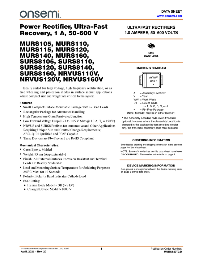 Power Rectifier, Ultra-Fast Recovery, 1 A, 600 V