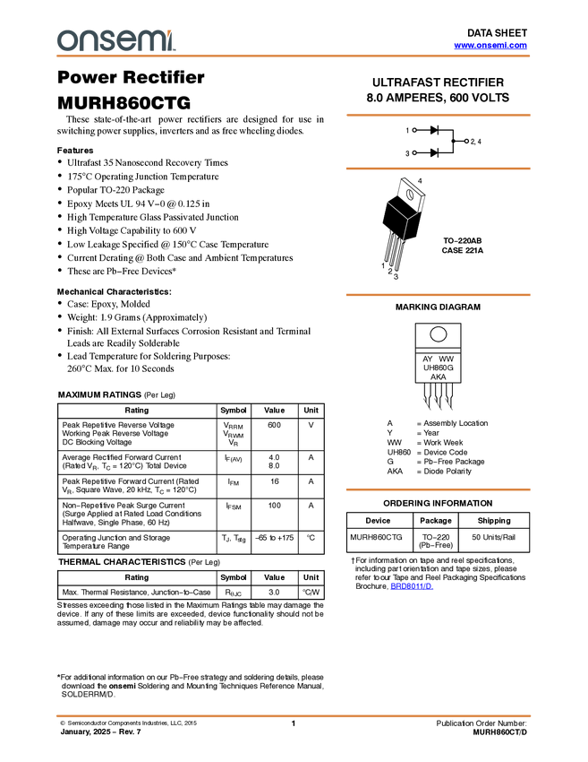 MURH860CT Power Rectifier, Ultra-Fast Recovery, 8 A, 600 V