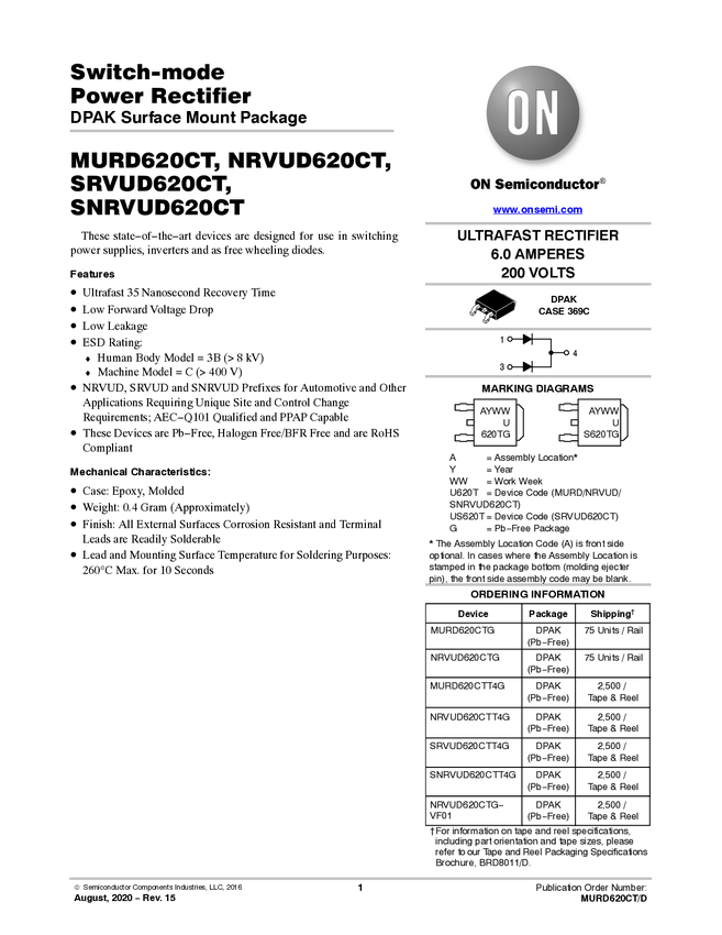 MURD620CT Power Rectifier, Ultra-Fast Recovery, Switch-mode, 6 A, 200 V