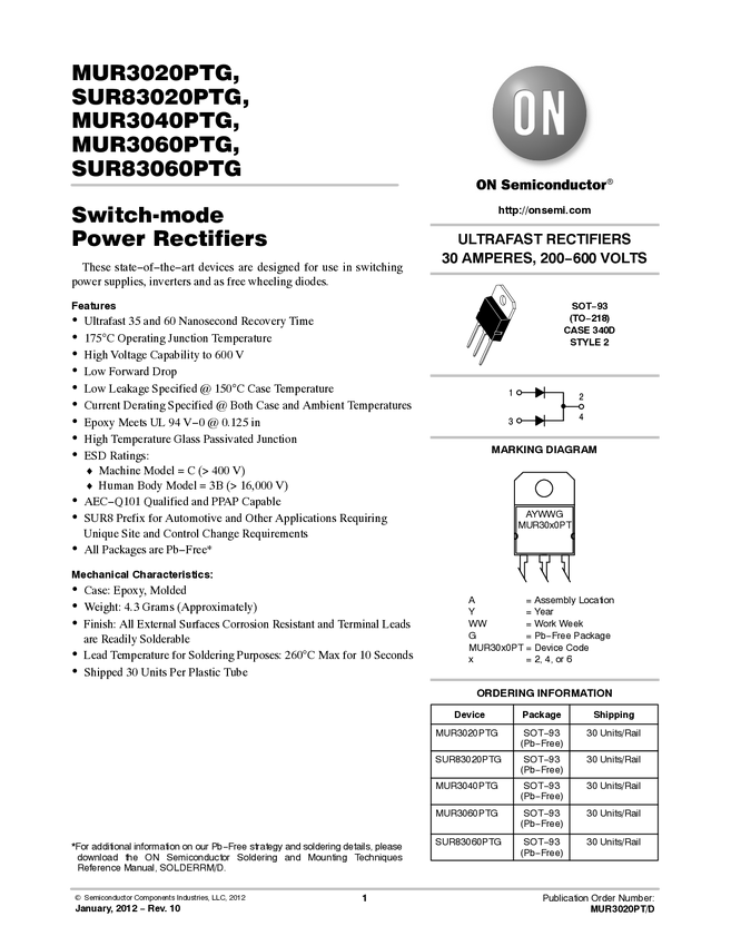 MUR3020PT 600 V, 30 A Ultrafast Rectifier