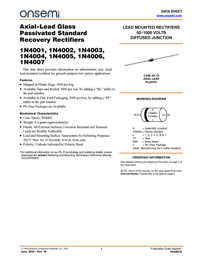 1N4001 Standard Rectifier, 1000 V, 1.0 A