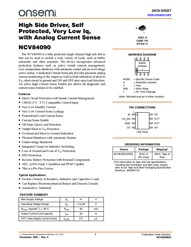NCV84090 Self Protected Very Low Iq High Side Driver with Analog Current Sense