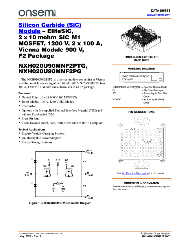NXH020U90MNF2 SiC Modules, Vienna Module 900V, 2 x 10 mohm SiC MOSFET, 1200V, 2 x 100A, F...