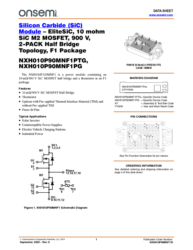NXH010P90MNF1 SiC Module, 2-PACK Half Bridge Topology, 900 V, 10 mohm SiC M2 MOSFET