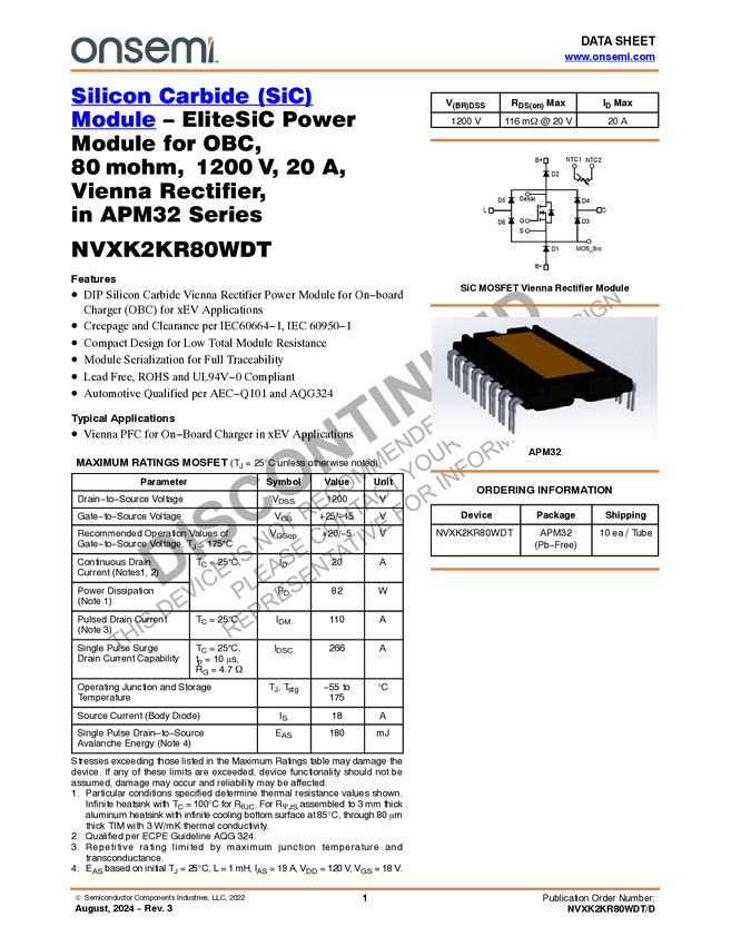 NVXK2KR80WDT EliteSiC Power Module for OBC, 80mΩ, 1200V, Vienna Rectifier, in APM32 Seri...