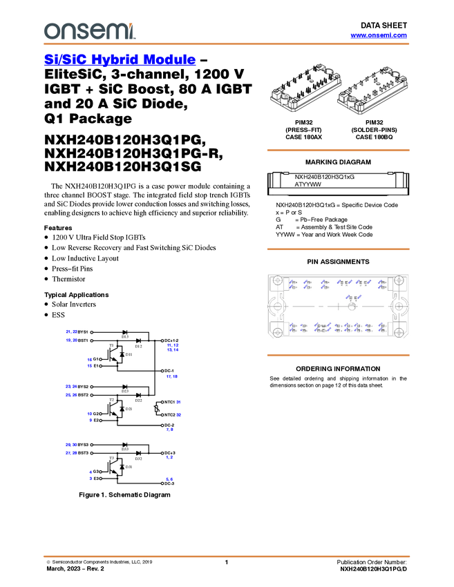 NXH240B120H3Q1 Power Integrated Module (PIM) 3-channel 1200 V IGBT + SiC Boost, 80 A IGBT...