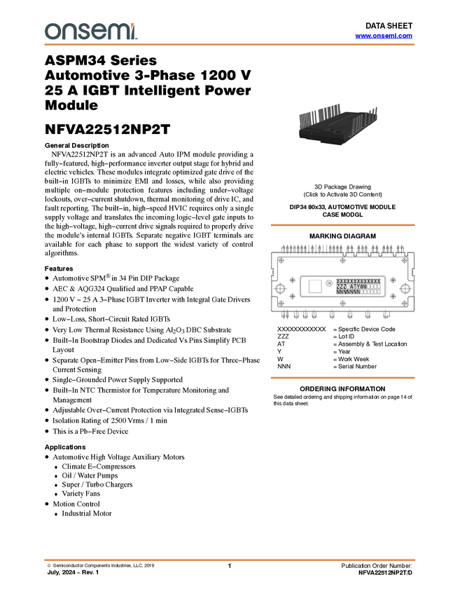 NFVA22512NP2T Intelligent Power Module (IPM), AEC-Q & AQG324, Automotive, Inverter 1200V,...
