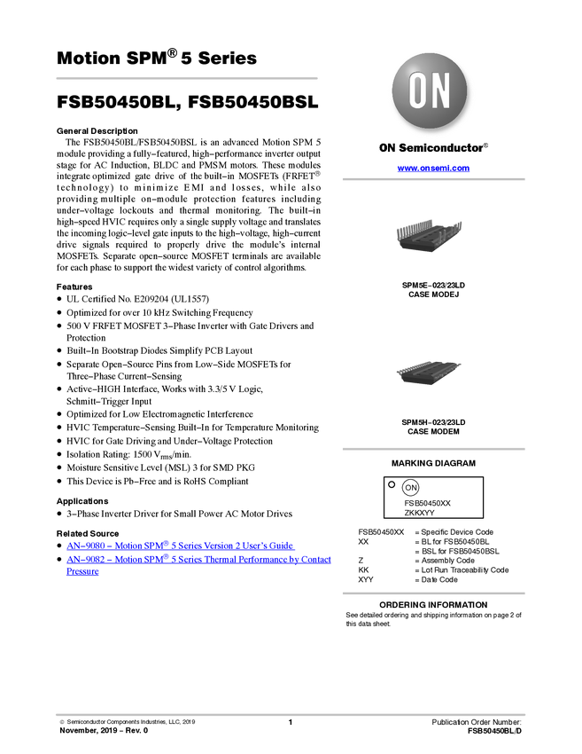 FSB50450BL Intelligent Power Module, 500V, 2.2A, Slow ver for EMI optimization