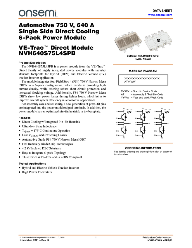 NVH640S75L4SPB VE-Trac Direct - Automotive 750V, 640A Single Side Direct Cooling 6-Pack Po...