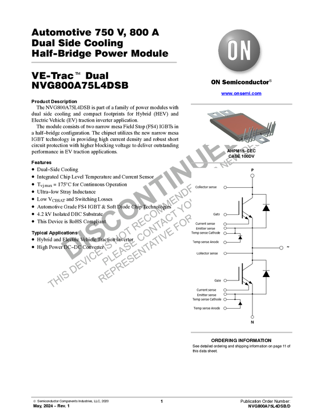 NVG800A75L4DSB VE-Trac Dual: Dual Side Cooling Half-Bridge Power Module for Automotive, 75...