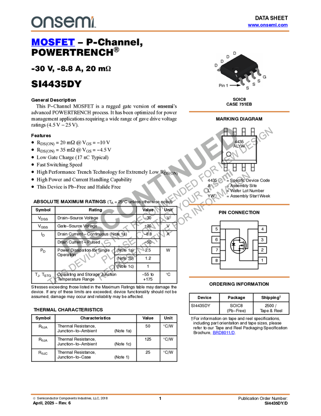 SI4435DY 30V P-Channel PowerTrench<sup>® MOSFET -8.8A, 20mΩ