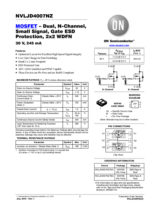 NVLJD4007NZ Dual N-Channel Small Signal Gate ESD Protection MOSFET 30V, 245mA, 7Ω