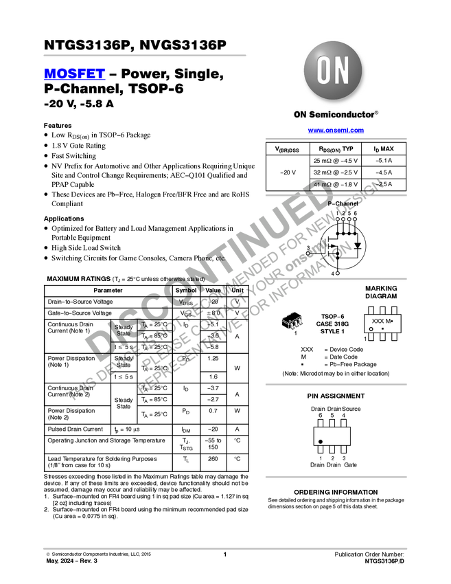 NVGS3136P Single P-Channel Power MOSFET -20V, -5.8A, 33mΩ