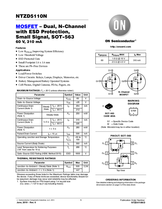 NTZD5110N Dual N-Channel Small Signal MOSFET with ESD Protection 60V, 310mA, 1.6Ω