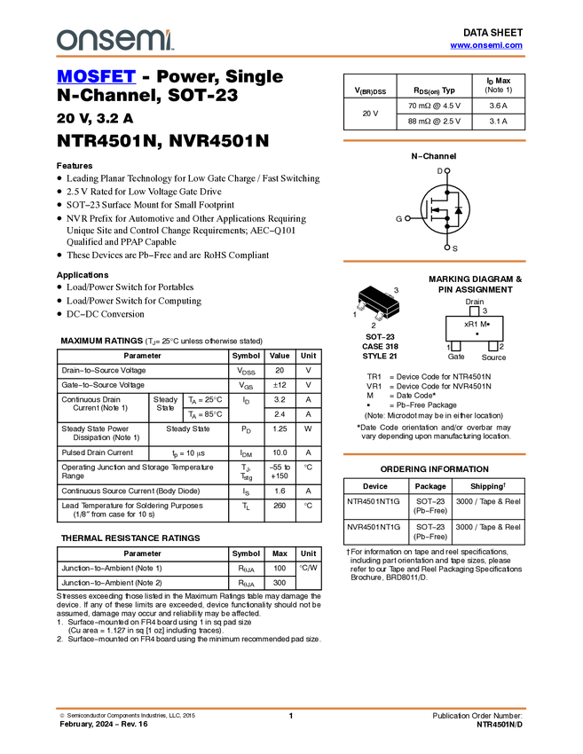 NTR4501 Single N-Channel Power MOSFET 20V, 3.2A, 80mΩ