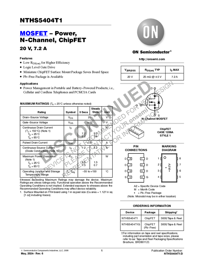 NTHS5404 Single N-Channel ChipFET™ Power MOSFET 20V 7.2A 30mΩ
