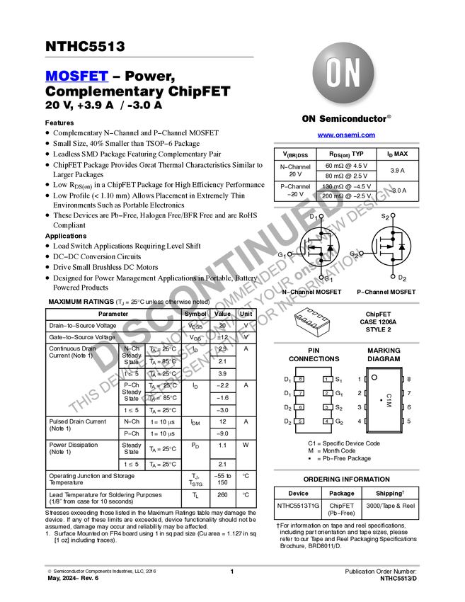 NTHC5513 Complementary ChipFET™ Power MOSFET 20V