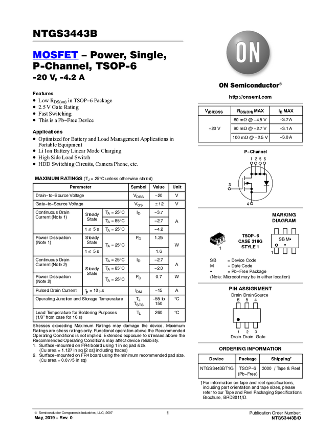 NTGS3443B Power MOSFET 20V 2A 65 mOhm Single P-Channel TSOP-6