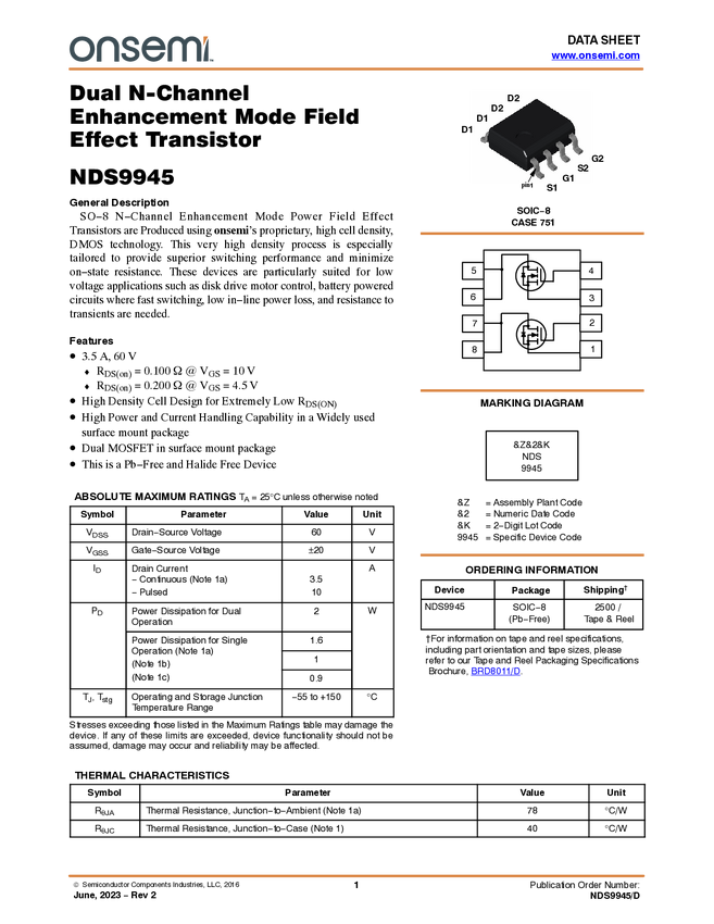 NDS9945 Dual N-Channel Enhancement Mode Field Effect Transistor 60V, 3.5A, 100mΩ
