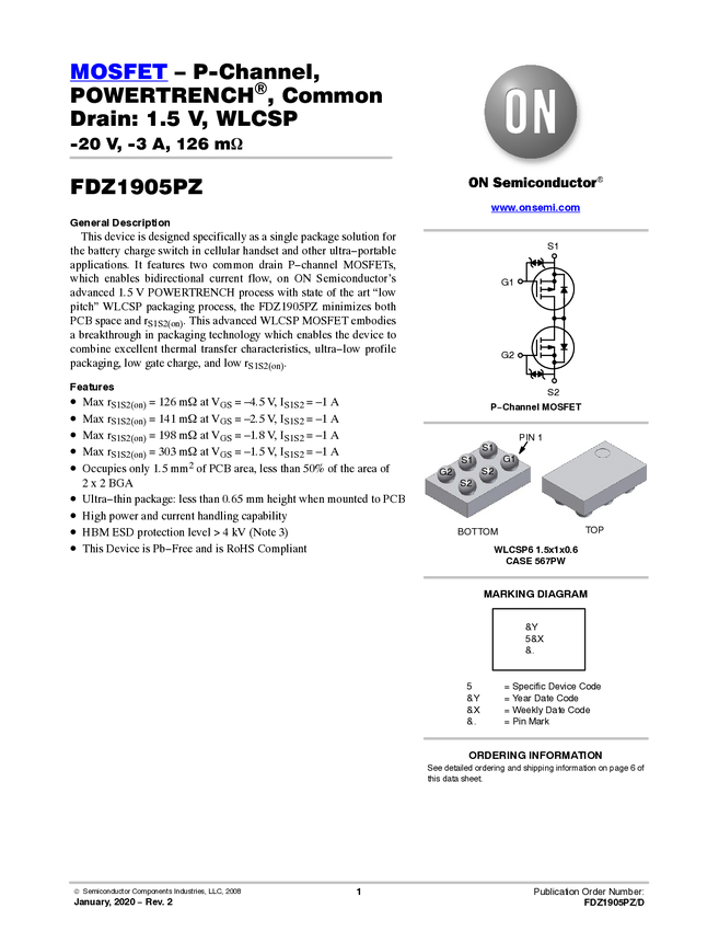 FDZ1905PZ Common Drain P-Channel 1.5V PowerTrench<sup>® WL-CSP MOSFET -20V, -3A, 123m...