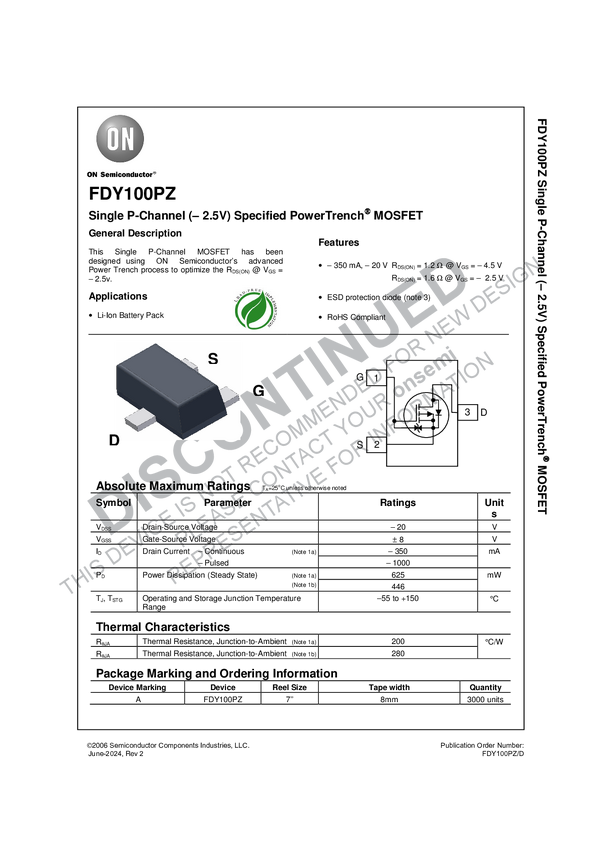 FDY100PZ P-Channel (- 2.5V) Specified PowerTrench<sup>® MOSFET -20V, -0.35A, 1.2Ω