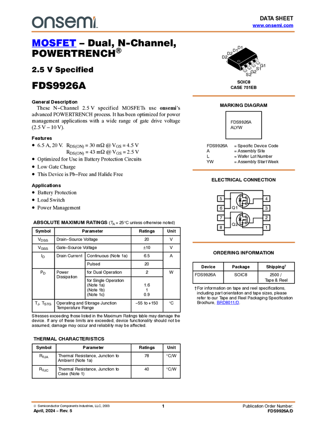 FDS9926A Dual N-Channel 2.5V Specified PowerTrench<sup>® MOSFET 20V, 6.5A, 30mΩ
