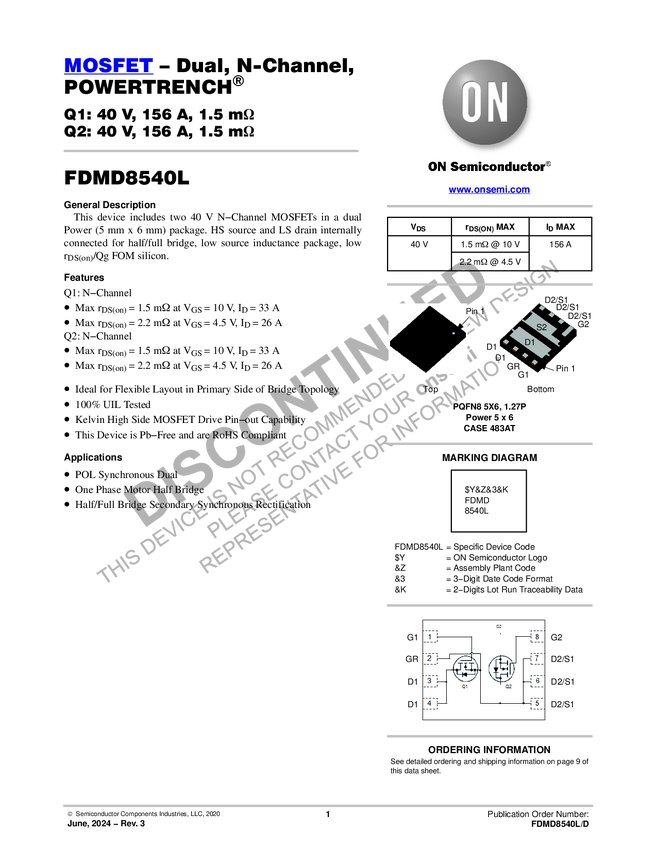 FDMD8540L Dual N-Channel PowerTrench<sup>® MOSFET 40V, 156A, 1.5mΩ