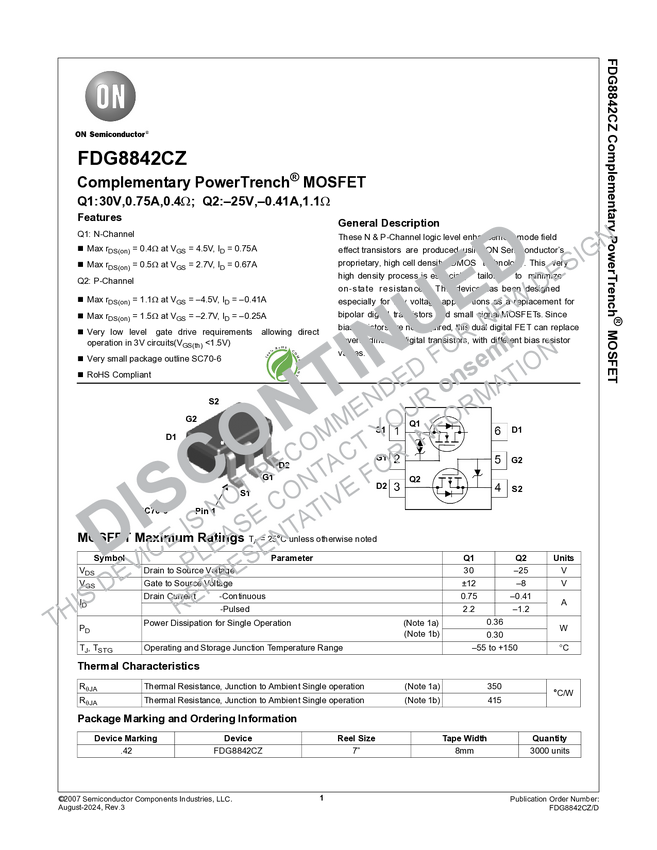 FDG8842CZ Complementary PowerTrench<sup>® MOSFET 30V/-25V