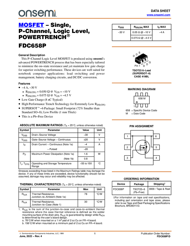 FDC658P Single P-Channel Logic Level PowerTrench<sup>® MOSFET -30V, -4A, 50mΩ