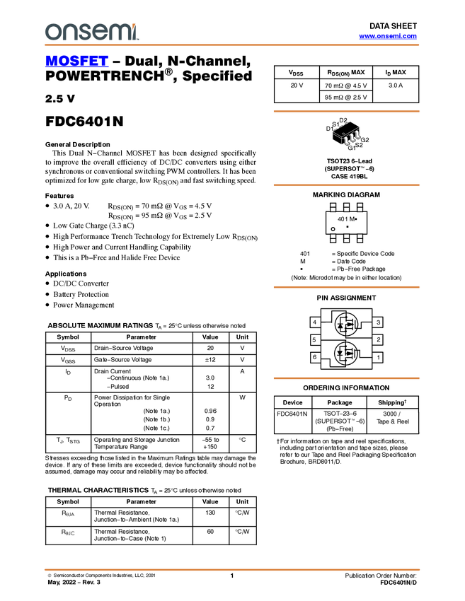 FDC6401N Dual N-Channel PowerTrench<sup>® MOSFET, 2.5V Specified, 20V, 3.0A, 70mΩ