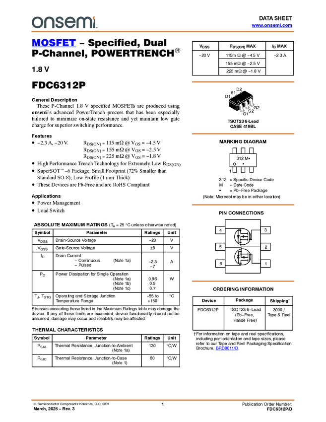 FDC6312P Dual P-Channel PowerTrench<sup>® MOSFET, 1.8V Specified, -20V, -2.3A, 115mΩ