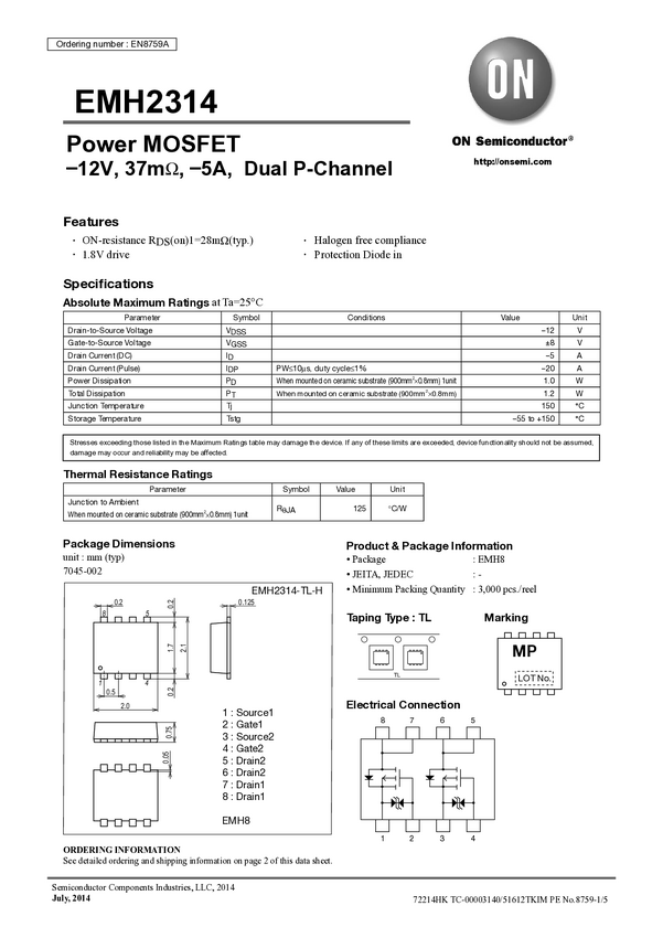 EMH2314 Power MOSFET, -12V, 37mΩ, -5A, Dual P-Channel