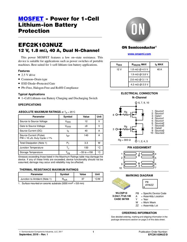 EFC2K103NUZTDG Dual N-Channel Power MOSFET 12V, 40A, 1.8mΩ